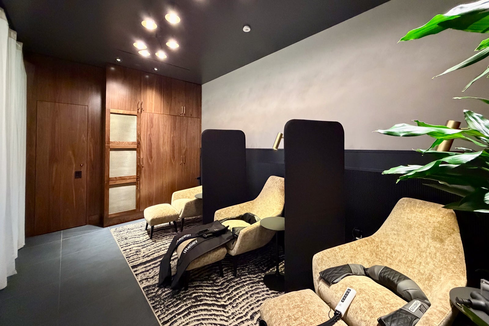 In addition to the terrace, you'll find a small multipurpose room that currently features three reclining chairs with massage boots. Amex thought this would be a popular amenity for those heading home from ski trips and hiking expeditions, though with only three chairs, I'd envision that this will get quite crowded. (This room was designed to potentially be converted down the line into more seating if needed.)
