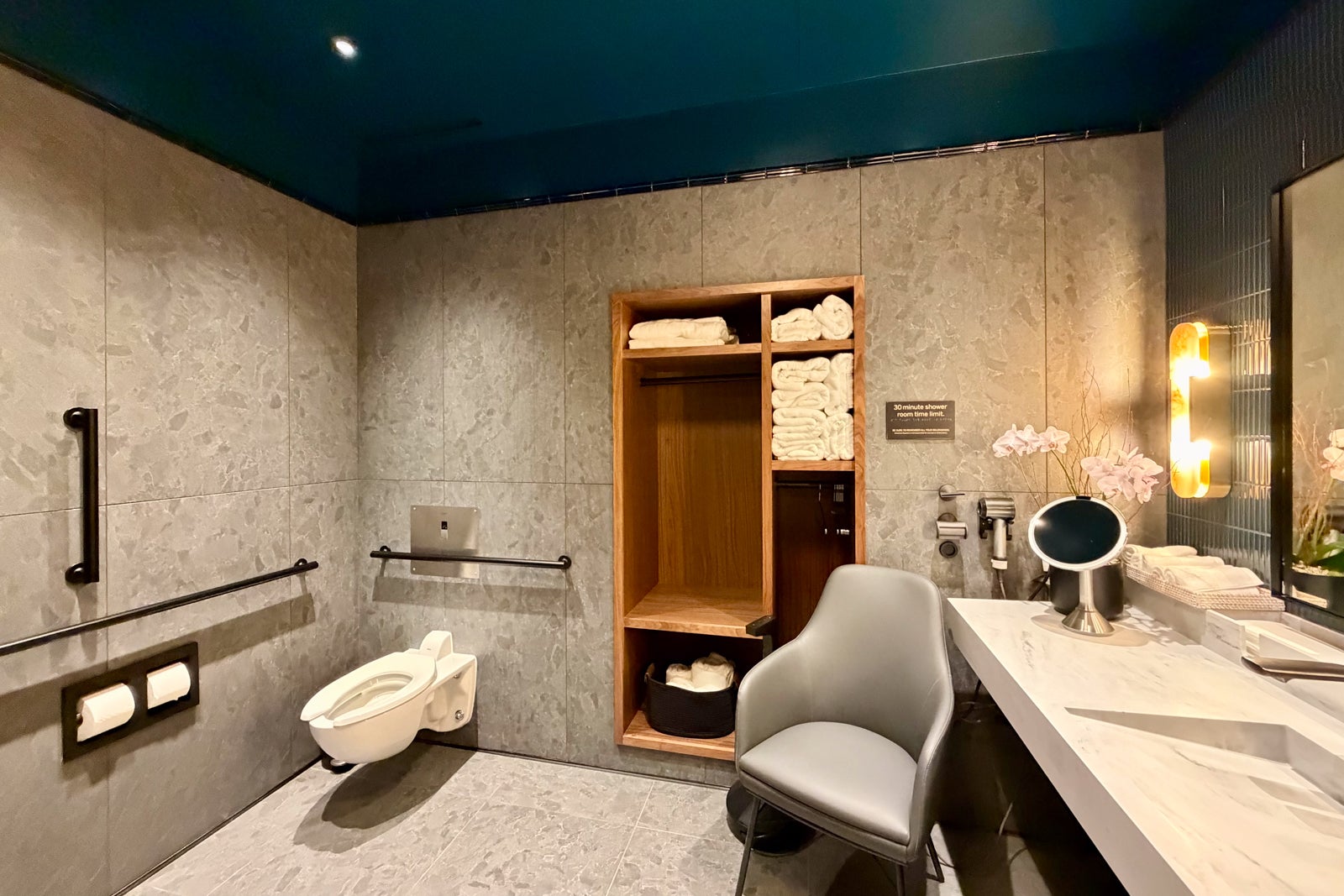 There's one shower in the lounge featuring L'Occitane products, and there is one set of gender-specific restrooms between the bar and the dining room.