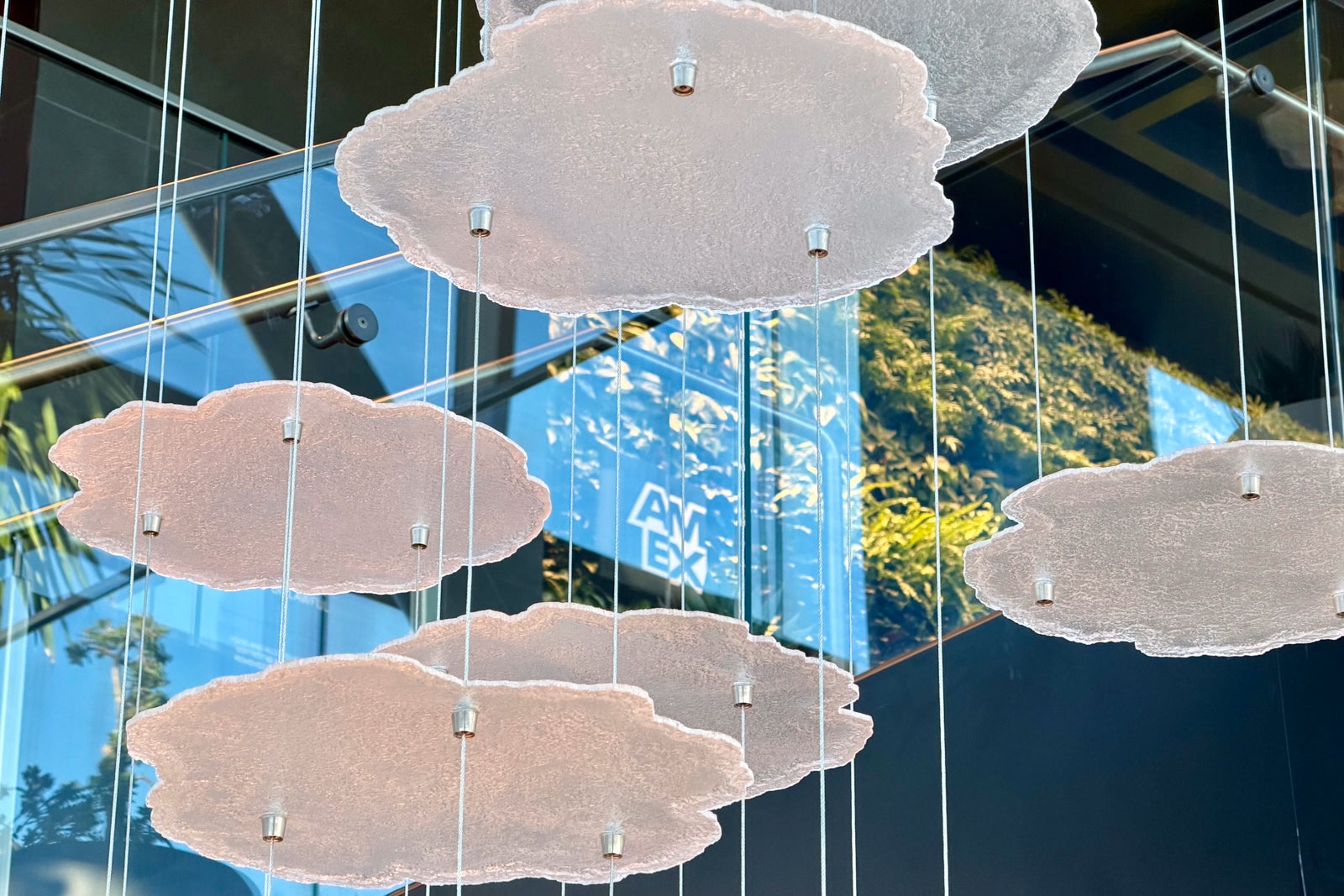 Lining the entrance are floor-to-ceiling windows that drench the space with light, and there's a stunning fixture hanging from the ceiling that's supposed to resemble the salt flats around the Salt Lake City region.